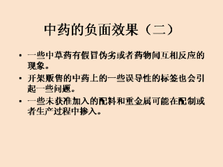 虽然中药总的来说是安全且有效的,但人们却发现有一些会产生有害的效果。由于人们对中药的质量和安全性大都不作检查,吃药时就会有各种风险——比如吃到假药,药品间产生反应,以及药中可能含有有毒的污染物等。错误的或者带有误导性的标签也是开架贩售的中药的问题所在。一些诊所甚至不能正确辨别中药的种类和准确地掌握使用剂量。