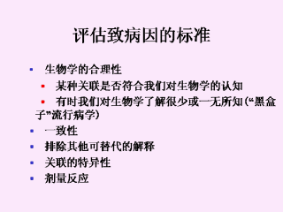 关联的特异性:特定的暴露只与某一疾病相关联—回到传染病理论—由先前因果关系的框架理论讨论得知此理论一般不适用