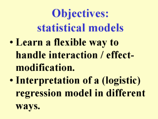 | A flexible yet simple way of investigating interaction / effect-modification is to specify the impact of an independent variable as a non-linear function of another variable. Such a regression model can be interpreted in more ways than one. Sometimes people focus to much on the odds ratio in a logistic regression model. Patterns of (log) odds can be derived from the same model and can provide insights. |