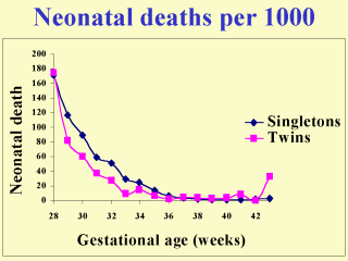 Twins born in the gestation range of 29-36 weeks had a mortality lower than singletons. Thereafter they had a higher mortality level.