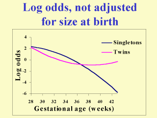 of birth. Without adjustment for size at birth, the mortality curve for twins turned upward after reaching it's lowest point at 38 weeks. |