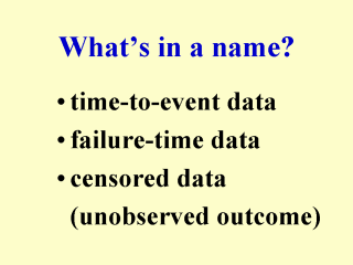 | The name "survival analysis" is slightly misleading. It is a technique for analysing "time-to-event" or "failure-time" data, which may or may not be related to survival and death in the usual sense. For brevity we will use the terms survival and death in this lecture. The value of a survival time variable must be larger than zero, i.e. a zero or a negative value is not allowed. A common problem in this type of data is censoring, meaning that the time-to-event is not observed. |