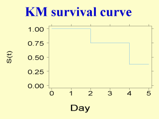 | The Kaplan-Meier (KM) survival curve from the hypothetical example is plotted. It is a step function: horizontal when there is no death and drops vertically down when there is a death. If the sample size is large and the follow-up time is measured in small interval of time, the KM survival curve will look roughly smooth. Some researchers may add symbols or numbers on the figure to indicate the timing of censored observations and the number of at risk subjects. |