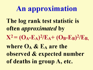 | There is a simple approximate of the log rank test statistic, as shown in the slide. The actual formula, as implemented by most statistical packages, is more complicated. See, e.g., Fisher LD, van Belle G. Biostatistics: A Methodology for the Health Sciences. N.Y.: Wiley, 1993: Chapter 16. |