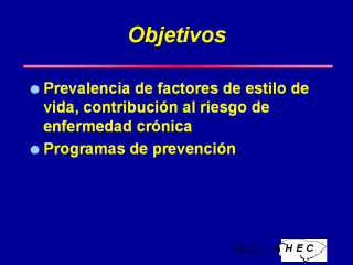 saludables más tiempo y aumentar la calidad de sus vidas. Objetivos específicos: Al terminar el módulo el lector será capaz de: Discutir la prevalencia de los factores de estilo de vida en los EUA y cómo contribuyen al riesgo de enfermedad crónica. Describir los programas de prevención enfocados en las modificaciones del estilo de vida. Se espera que esta conferencia estimule la discusión entre los lectores. Salud es un tópico que ofrece bases comunes entre las personas y la mayoría tienen áreas de reto relacionadas a salud. Puede ser de ayuda compartir nuestra preparación en salud entre todos nosotros. |