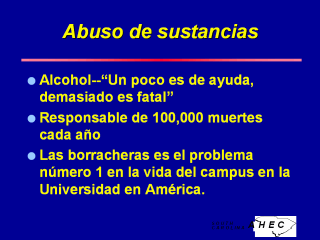 | Abuso de sustancias – Alcohol Alcohol está en tercer lugar en términos de factores de estilo de vida que contribuyen a la muerte por accidentes y enfermedad. Aproximadamente 100,000 muertes cada año son atribuidas al uso del alcohol, muchas de ellas de accidentes en automóviles que involucran la ingesta de alcohol. 18 millones de americanos sufren de la dependencia al alcohol. La ingesta excesiva de alcohol está altamente asociada con cirrosis del hígado y aumento del riesgo de ciertos tipos de cáncer (boca, esófago y garganta). La combinación de beber y fumar incrementa significativamente el riesgo de estos cánceres y las personas que beben son más probable que fumen. Alcohol es interesante ya que la ingesta moderada se sabe que beneficia la salud, mientras que la ingesta excesiva contribuye a serias enfermedades. Un vaso de vino diario está asociado con mejoría de la salud cardiovascular, particularmente disminuyendo el colesterol. Vino tinto ha mostrado tener la asociación más positiva. |