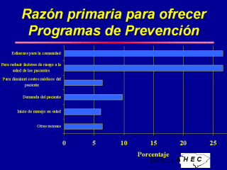 ofrecen servicios de prevención? Esos son datos de un estudio nacional conducido por Wilson et al, publicado en 1997. El estudio encuestó a 600 hospitales en el país sobre servicios preventivos que ofrecían a pacientes y comunidades. Esta diapositiva muestra las razones de los hospitales para ofrecer tales programas. Podemos que las instituciones de atención en salud usan la promoción de la salud con una herramienta de marketing tanto como lo usan para mejorar la salud de la comunidad. En otras palabras si las personas sus servicios para aprender como prevenir la enfermedad, entonces pueden usar sus servicios cuando enfermen. Sin embargo, hay debate entre los expertos acerca de los beneficios financieros de la prevención y muchos sienten que no genera ingresos. |