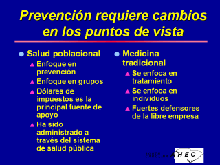 Tradicional Cuando pensamos en salud poblacional en comparación a la medicina más tradicional, hay varias formas que pueden ser usadas para ilustrar las diferencias. En la medicina tradicional, la relación-médico-paciente es alatamente evaluada y el enfoque es en el tratamiento individualizado. En salud poblacional, se enfoca más en grupos comunitarios de personas y en identificación de formas de prevención de enfermedad entre el grupo. La administración de inmunizaciones es un buen ejemplo de este tipo de atención en salud. Cómo se perciben los problemas de salud El proceso en la medicina tradicional es usualmente responder a los síntomas reportados por el paciente. O sea, reaccionando a los síntomas, un médico hace un diagnóstico y recomienda el tratamiento para un paciente individual. En salud poblacional el enfoque es sobre la prevención más que en el tratamiento de la enfermedad. Es proactivo más que reactivo. Algunas veces la forma es cambiar los hábitos de salud informando a las personas a través de los medios masivos de comunicación. De esta forma grupos completos, pueden accesar a este tipo de atención en salud. |