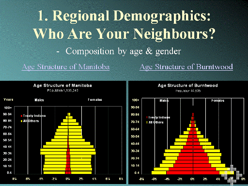 So, compared to other regions, how many people are likely to enter the door of the various types of health services? The “population pyramid” summarizes this information in one picture. E.G. In the pyramid above, the majority of the residents of the Burntwood RHA are younger (13% are 0 - 4 yrs old); 24% are females between ages 15 and 44. These percentages are similar to Manitoba overall, where 11% are between 0 and 4 yrs, and 22% are females between ages 15 and 44. However, in Manitoba, the distribution is less ‘triangular’, with the majority of residents between 30 and 39 years. Questions for Planners 1. How does the RHA’s population pyramid compare to the province? To other regions? 2. How will pyramid affect the types of service delivery? (Younger population may indicate younger families requiring prenatal care, maternity & pediatric services & immunization programs) 3. How many people could possibly require health services? |