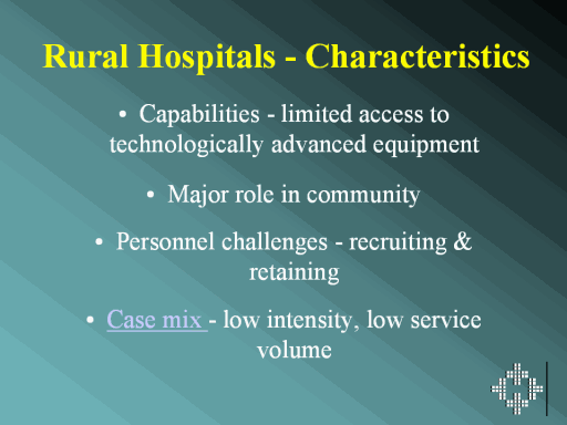 for other hospitals to emulate. Performance evaluations of rural hospitals must be sensitive to their differences from urban hospitals. Development of hospital-based indicators suited for rural hospitals should be a collaborative effort between researchers and key stakeholders. These indicators may also help guide analyses. For example, because of the low volume of cases handled by rural hospitals, Stewart et al (2000)10 based their performance analysis on a three-year average (fiscal years 1996-1998) rather than on a single year. Combining a population-based perspective (how much hospital care populations are using, weighed against their need) with measures of individual hospital performance provides health planners with comprehensive data to make informed decisions about the patterns of use of various hospitals in their regions. |