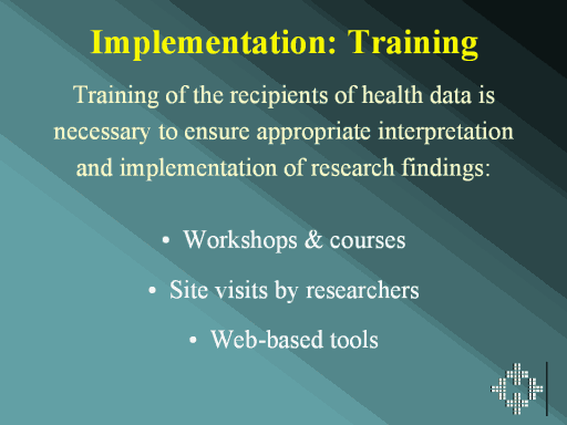 grant, will also be held on site in each of the RHAs. Alberta Heritage Foundation for Medical Research (AHFMR)’s SEARCH program seeks to equip RHA personnel to "identify and use appropriately timed information for managing the health system and to participate in health research activities relevant to local needs." Their training extends over a six-week period. 2. Site visits - on-site meetings between Centre researchers and RHA personnel provide researchers with a first-hand view of the specific RHA and helps them understand the context in which the various decision-makers work. 3. Web tools - MCHP’s Concept Dictionary provides technical support for programmers and researchers using data from the Centre. Future projects seek to follow this model to develop a tool even more relevant to the needs of RHA-based health researchers. |