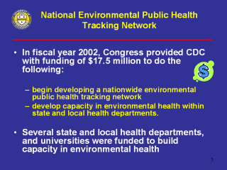 | In 2002, Congress approved funding of $17.5 million to begin construct a nationwide environmental public health tracking network and develop capacity in environmental health within state and local health departments. |