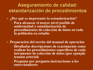 maximizar la probabilidad de que las tareas sean realizadas uniformemente. Por ejemplo, descripción de procedimiento para medición de la tensión arterial debería incluir la calibración del aparato con que se mide la tensión arterial, la posición del participante, la cantidad de tiempo en reposo antes y entre mediciones, el tamaño del brazalete, la posición del brazalete en el brazo. |