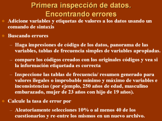 cualquier estadio, siendo capaces de duplicar el proceso. Manejando datos inconsistentes Regrese a la fuente Recodifique datos desaparecidos Examine otra información disponible y juzgue cual pieza de información es probable que sea la correcta (no recomendado) Decida cual método y sea consistente. Documente por escrito. Cálculo de la tasa de error Numerador será el número de errores en el archivo final y el denominador será el (número de registros * número de campos) en el nuevo archivo. Tasas de error menor al 0.3% es considerada aceptable. |