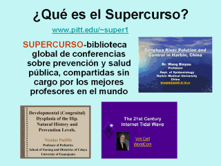 Supercurso están dedicadas al tema de investigación global. Estudiantes de medicina pueden aprender directamente de las conferencias. Ellos también pueden usar las conferencias y diapositivas para presentarlas a sus pacientes, la comunidad o sus estudiantes. Panorma del Supercurso http://www.pitt.edu/~super1/lecture/lec6961/index.htm |