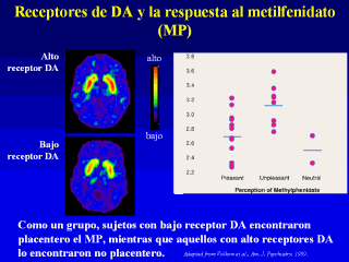El nivel de receptores de dopamina en el cerebro de la persona puede influir en el gusto o no por una droga. Debido a que la dopamina está involucrada en los efectos de recompensa por el abuso de drogas, se hipotetiza que la variación normal entre individuos en los receptores de dopamina podría influenciar la respuesta a las personas a la exposición a drogas. En este estudio a los hombres se les administró metilfenidato (Ritalin) y sus cerebros fueron registrados con PET. Aquellos que tuvieron altos niveles de receptores de dopamina encontraron la experiencia no placentera, mientras que aquellos con bajos niveles de dopamina la encontraron placentera. Esto sugiere que las diferencias individuales en un marcador de la función de la dopamina puede influenciar la susceptibilidad de un individuo a la adicción.