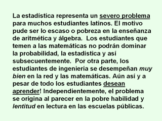 Esto parecerá simple, pero no lo es ! A la carrera de biología se entra por algunos estudiantes, que la consideran como un refugio contra las matemáticas. Ellos se encuentran protegidos en ocasiones debido a que algunos o quizá la mayoría de los profesores sufren del mismo mal de actitud anti-matemáticas. Los profesores sin educación suficiente pueden accidentalmente formar una tradición anti-matemáticas. Las personas que enseñan estadística en el nivel licenciatura tendrán un futuro bastante difícil! |