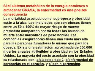 es rebasado únicamente por la de fumadores. En el período entre 1994-96 en los EEUU, la pizza, comida mexicana, comidas china, hamburguesas, papas fritas y hamburguesas con queso contribuyeron con 10.8% del total de ingesta de grasas, esos 6 alimentos contribuían únicamente el 1.9% en 1965. (Rev Med 2001 32:245-254). Esto es más de 5.2 veces mayor ! El anunciado de que el cambio en ingesta de grasas en los USA entre 1965-96 es una prueba necesaria y suficiente para entender que los alimentos grasos están contribuyendo fuertemente para la explosión de obesidad. |