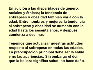Por ejemplo: 1/ Educar a todos los que serán padres acerca de los múltiples beneficios de amamantar a sus bebés con pecho. 2/ Las madres quienes amamantas a sus hijos regresan a su peso pre-embarazo más fácilmente. 3/ Educar a quienes proporcionan servicios en la salud y de sus estudiantes en la prevención y tratamiento del sobrepeso y obesidad durante toda la vida. Adoptar políticas específicas sobre todas la bebidas y alimentos disponibles en las escuelas especificando que pueden contribuir en los patrones de alimentación y que sean consistentes con los dictados del Departamento de Agricultura de los EEUUAA (USDA) en la Guía dietética para los Americanos Dietary Guidlines for Americans. Proporcionar opciones de alimentos que sean bajos en calorías, grasas y azúcares agregados, tales como a los pasteles. Proporcionar más frutas, vegetales, harinas integrales, alimentos bajo en grasas o sin mantequillas. Reducir el acceso a los alimentos de conveniencia altos en grasas, calorías y azúcares agregados y a los de porciones enormes. La tendencia al sobrepeso, ajustado por edad (IMC de 25.0 o mayor) se incremento pasando de 55.9 al 65.1% como aparece en las publicaciones del Instituto Nacional de Salud y Estudios de Evaluación de la Nutrición de los Estados Unidos de América (NHANES) compendios del 1988-94 y los del 1999-2002. NHANES III (US National Health and Nutrition Estimate Studies 3) (1988–94) y en NHANES (1999–2002). La tendencia a obesidad en el IMC 30 o más también se incrementó en ese mismo período pasando de 22.9 a 30.4%. El índice de obesidad extrema (IMC 40 o más) también se incremento, pasando de 2.9 al 4.9% como se cita en JAMA 2004; 291-2847-2850.
