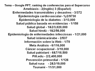 | De los 15 temas del Supercurso que hemos examinado sus rankings de páginas, 14 estuvieron en los primeros 10 en términos de rankings de páginas. Lo sorprendente es que para algunas, como Salud Global, fue no sólo con conferencias, sino sobre páginas de salud global en la Web. |
