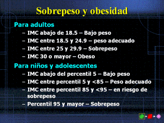 mayor es considerada obesa. Por ejemplo un hombre delgado de 6 pies (~1.8 m) que pesa 180 libras (~82 kg) tiene IMC de casi 24, el cual está en el extremo superior del rango normal. A 200 libras (~91 kg), tendría IMC de casi 27, lo cual significa sobrepeso. A 225 libras (~102 kg), tienen IMC de más de 30, y por lo tanto es obeso. Sobrepeso es definido en forma diferente en niños y adolescentes. Después de calculado el IMC, es pasado a gráficas – basadas en encuestas nacionales reunidas antes del reciente incremento en obesidad – para obtener un ranking de percentiles. Si el IMC de un niño está arriba del percentil 85 para su edad, está en riesgo de sobrepeso, Si el IMC de un niño está arriba del percentil 95, esta en sobrepeso. No hay una definición universalmente aceptada para obesidad distinguiéndola de sobrepeso, en este grupo de edad. Es posible tener elevado IMC y estar saludable. Por ejemplo, personas atléticas y con gran masa muscular pueden tener IMC de más de 25, pero están saludables. También mediciones de IMC no pueden aplicarse en mujeres embarazadas. Sin embargo, IMC es una herramienta útil. |