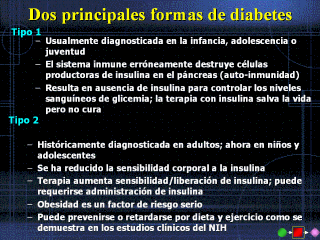 | Hay dos formas principales de diabetes. Tipo 1, antiguamente conocida como diabetes “juvenil”, es la forma de diabetes que fue históricamente más probable de ser detectada en jóvenes. La diabetes tipo 2, conocida como diabetes del “adulto” es responsable del 90-95% de los casos de diabetes. Históricamente se ha detectado en adultos mayores. Sin embargo, como la epidemia de obesidad ha llegado a niveles alarmantes en niños y adolescentes, estamos viendo más casos de diabetes tipo 2 en personas jóvenes. Afortunadamente, las investigaciones apoyadas por NIDDK han mostrado que la diabetes tipos 2 puede ser prevenida o retardada en el adulto y un estudio actual está examinando si una forma similar puede usarse en niños en riesgo de desarrollar la enfermedad. |