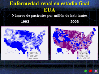estabilizado, al menos en algunas poblaciones. Estos datos están reunidos por el sistema de enfermedad renal de EUA o USRDS. El USRDS es un sistema de datos nacional que reúne, analiza, y distribuye la información acerca de enfermedad renal en estadio final (ESRD) en los Estados Unidos. El USRDS es apoyado directamente por NIDDK junto con los centros de Medicare y Servicios Médicos. Nota: Los mapas indican punto de prevalencia al 31 de Diciembre; tasas ajustadas por edad, género y raza. |