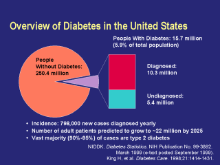 not been medically diagnosed. Nearly 800,000 individuals are diagnosed each year with diabetes. By the year 2025, it is estimated that nearly 22 million adults in the United States will have diabetes. Similarly, the number of patients with diabetes worldwide is predicted to increase substantially over this period. The most common form—type 2 diabetes—accounts for 90% to 95% of all diagnosed cases, whereas type 1 diabetes accounts for 5% to 10% of all diagnosed cases. Other forms of diabetes may result from specific genetic syndromes, surgery, drugs, malnutrition, infections, or other illnesses; these account for 1% to 2% of all diagnosed cases. Finally, gestational diabetes occurs in 2% to 5% of all pregnancies but resolves once the pregnancy is completed. In some studies, in nearly 40% of women who had gestational diabetes, diabetes later developed. NIDDK. Diabetes Statistics. NIH Publication No. 99-3892. March 1999 (e-text posted September 1999). Available at: http://www.niddk.nih.gov/health/diabetes/pubs/dmstats/dmstats.htm