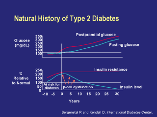 levels. As time progresses, the insulin resistance reaches a peak and stabilizes, while the compensatory increase in insulin continues to prevent fasting glucose levels from becoming abnormal. However, at some point, either because of early beta-cell dysfunction or because of a natural limit of beta-cell capacity, challenge of this delicate balance with a glucose load may demonstrate that, although fasting glucose levels remain normal, postprandial glucose levels become abnormal as a limitation in insulin response is reached. Following the onset of beta-cell dysfunction, insulin levels can no longer keep up in overcoming the insulin resistance, and fasting and postprandial glucose levels increase progressively over time. |