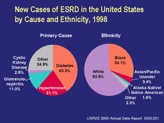 glomerulonephritis, cystic kidney disease, and other causes. Whites accounted for the majority (62.6%) of new ESRD cases in 1998, but, notably, African Americans (12.8% of the population in general) accounted for a disproportionately large percentage (30.1%) of these cases. This finding is consistent with the higher incidence of diabetes in the African American population. Asians/Pacific Islanders and Alaska Natives/Native Americans accounted for small proportions of the new ESRD cases, 3.4% and 1.6%, respectively. USRDS 2000 Annual Data Report. 2000:251. |