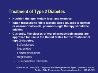 patients with type 2 diabetes. When 3 months of dietary modification and exercise alone do not result in near-normalization of blood glucose levels, oral antidiabetic agents should be initiated as adjunctive therapy. In the United States, there are currently five classes of oral pharmacologic agents that have been approved for the treatment of type 2 diabetes. These include sulfonylureas, biguanides, thiazolidinediones, meglitinides, and alpha-glucosidase inhibitors. Edelman SV, Henry RR. Diagnosis and Management of Type 2 Diabetes. 3rd ed. Caddo, Okla: Professional Communications, Inc; 1999:45-102. |