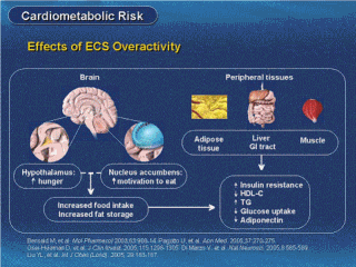 In the peripheral arena, ECS overactivation promotes lipogenesis at the level of adipose tissue and the liver. ECS activity in the GI tract interferes with feelings of satiety, and CB1-R stimulation of skeletal muscle decreases glucose uptake. All of these central and peripheral effects contribute to the increased risk of dyslipidemia, insulin resistance, glucose intolerance and increased cardiometabolic risk.