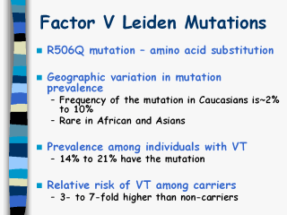 | A mutation in Factor V Leiden, which results in an amino acid substitution, also increases risk of VT. |