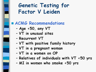 | The American College of Medical Genetics has recommended that genetic testing for the Factor V Leiden mutation be offered to women with the characteristics described above. |