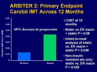 The change in CIMT from baseline to 12 months was 0.044 mm in the placebo group (P<0.001) and 0.014 mm in the ER-niacin group (P=0.023). Thus, the increase in CIMT was 3-fold greater in the placebo than in the ER-niacin group. There was a trend towards significance for the between-group comparison of the rate of progression for the placebo and ER-niacin groups (P=0.08). Taylor AJ, et al. ARBITER 2: A double-blind, placebo-controlled study of extended-release niacin on Atherosclerosis progression in secondary prevention patients treated with statins.