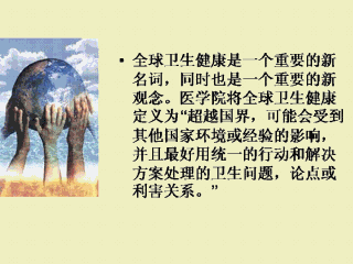 然而,跨越国界或者全世界的国家共同面对的不只是卫生问题;这些问题的对策也不应当局限于国界之内,而应该为不同的国家所共享,无论它们的发展水平如何。所有的国家,都可以从别的国家学习,或者分享自己的经验与信息。全球卫生健康这一富于启发性的概念描绘了一条双向大道的图画:分担问题,分享对策。这一新概念对全球卫生科学非常重要,因为全球卫生健康被描述成一条共享之路。(From