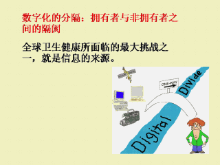 除了各种各样的疾病,我们还要说明一点,全球卫生健康面对的最大挑战之一是获取信息的渠道。我们需要跨越数字化的分隔来共享全球卫生健康研究领域的信息。很多临床实践和预防工作都是对信息的共享。如果能够利用信息革命我们就能对我们的病人和全世界的人产生深远的影响。