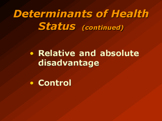 status. Another recently recognised determinant, closely linked to socio-economic status, is the degree to which people have control over their lives - the “control factor”. |