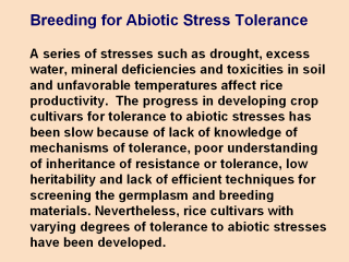 | Rainfed rice is planted to about 40 million hectares worldwide. Vast areas suffer from drought at some stage of growth cycle. QTL for various component traits of drought tolerance have been mapped and the information is being utilized to develop improved cultivars with drought tolerance. |