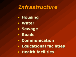 to housing, water supply, sewage systems, roads and communication facilities, educational