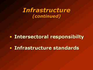 Some jurisdictions, such as the Northern Territory have introduced a set of minimum standards which all infrastructure developments are required to meet. These standards take environmental health as a primary consideration. |