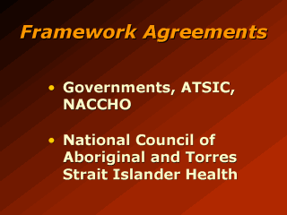 The Commonwealth government has committed itself to a partnership with the State and territory governments, ATSIC and NACCHO (the National Aboriginal Community Controlled Health Organisations peak body). The so-called “Framework Agreements” provide the framework for a collaborative approach to addressing Indigenous health needs, involving government and community organisations, and provide for a partnership approach to planning and priority setting. A National Council of Aboriginal and Torres Strait Islander Health has been established to mobilise leadership and support coordination at the national level. The council has a mandate to comment on federal, state and local government responsibilities. |