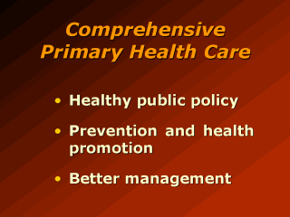 Effectively addressing these depends on the adequacy of primary health care, including: - promotion and implementation of healthy public policy for the development of the social and physical environment,- prevention and health promotion, - better management programs which ensure timely check-ups, and early referrals to specialist services where necessary. These can be supported by the development and implementation of appropriate best practice protocols. |