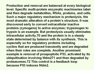 regulation by liability is the removal of mRNAs, balanced by their transcriptions. For cells also, proliferation is balanced by loss which can be caused by an organized series of molecular steps termed Programmed Cell Death (apoptosis), often reviewed see ref. 57. A key to this complex process is the apoptosis activating tumor suppressor p53 protein. It is very frequently inactivated in cancers. Another antiapoptotic molecule is the transcription factor NF-kB, constitutively elevated in many cancers. Its activation provides an example of the complexity of regulation. NF-kB is usually as an inactive protein dimer combined with an inhibitory protein IkB, and is located in the cytoplasm. An activated kinase cascade causes phosphorylation of IkB and releases it from NF-kB, followed by proteolytic degradation. The freed NF-kB relocalizes, moving into the nucleus where it itself is phosphorylated and binds to DNA motifs to activate over 100 transcriptions. Furthermore a feedback control is brought into play by NF-vB’s transcription of IkB, the inhibitor of its activation.73 |