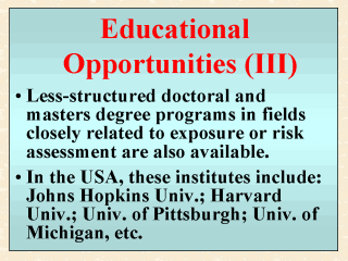 assessment is currently offered through the School's DEOH. Graduate students at the Johns Hopkins University (Bloomberg) School of Public Health may develop a knowledge base in the detection of human exposure and risk and in exposure assessment, through either the Division of Toxicological Sciences or the Division of Occupational and Environmental Health. Graduate programs in environmental epidemiology, environmental molecular epidemiology, and occupational epidemiology are available at the Harvard School of Public Health to equip students with the skills in the application of biomarkers, exposure assessment, assessment of environmental health risk, and statistical modeling of dose-response relationships. The Environmental Health (EH) Program at the University of Michigan School of Public Health is claimed to be "one of the most highly regarded training programs" in the USA. It is said to be "built around a broad-based multidisciplinary framework" to allow graduate students to specialize in air pollution, risk assessment, hazardous wastes, and other familiar areas in EH. |