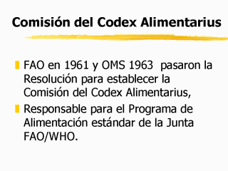 La Asamblea de Salud Mundial formalmente aceptó el programa conjunto de la FAO/OMS para estándares alimenticios, completamente aceptando la responsabilidad en relación con todos los aspectos de alimentación para la salud, en su 16ª sesión, efectuada en Mayo de 1963 y aceptó el Estatuto de la Comisión del Codex Alimentarius.