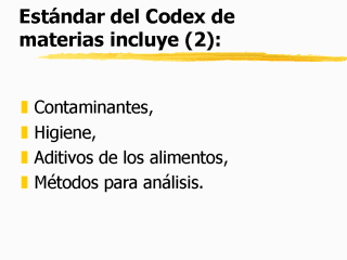 Los estándares relacionados a la composición básica y la calidad de factores aseguran que la calidad no esté por debajo de los estándares, mientras que los estándares para aditivos de alimentos y contaminantes así como los estándares de higiene protegen la salud de los consumidores.