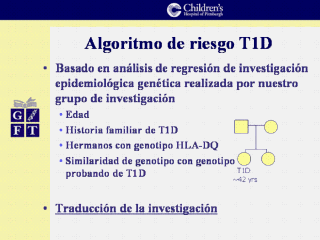 Desarrollamos un algoritmo de riesgo, el cual consideró la edad del niño,  su historia familiar de T1D, su genotipo HLA-DQ y la similaridad de sus genotipos al genotipo de T1D del niño usando datos de un estudio familiar que efectuamos hace algunos años. Este estudio estuvo basado  en familias con al menos un nilño con T1D. Sin embargo, los individuos fueron T1D de ~42 años de edad cuando las familias fueron estudiadas. Por lo tanto, cualquier hermano que fuera a desarrollar T1D ya había, probablemente, haber desarrollado la enfermedad, ya que el pico de edad de ataque de T1D es lña pubertad. Por lo tanto, nuestra estimación de riesgo de T1fue tan seguro como fue posible.
