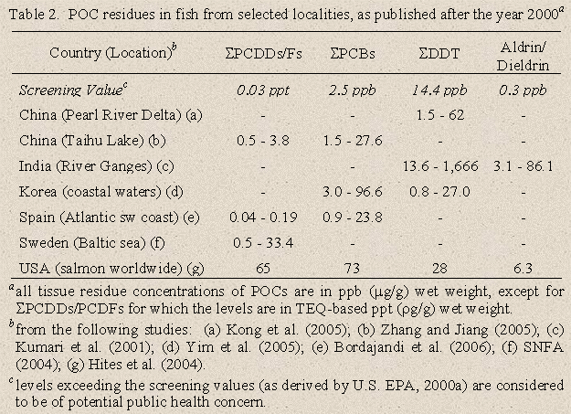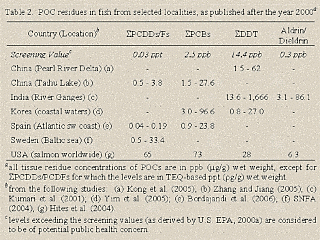 the residue levels of POCs from sample studies reported since the year 2000.