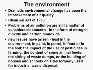 so-called “smog”. But in spite of this major improvement in air quality, and thus in the frequency of respiratory illness in both young and old, problems of air pollution are still a matter of considerable concern - in the form of nitrogen dioxide and carbon monoxide rather than sulphur and soot. Past problems with both domestic and public hygiene in terms of adequate sanitation, sewage and water supplies have largely been rectified. But new issues have arisen - lead in the environment, in paint, in petrol, in food or in the soil; the impact of the use of pesticides in farming; the content of some animal feeds; the siting of waste dumps, or the building of houses and schools on sites formerly used for industrial waste disposal. |